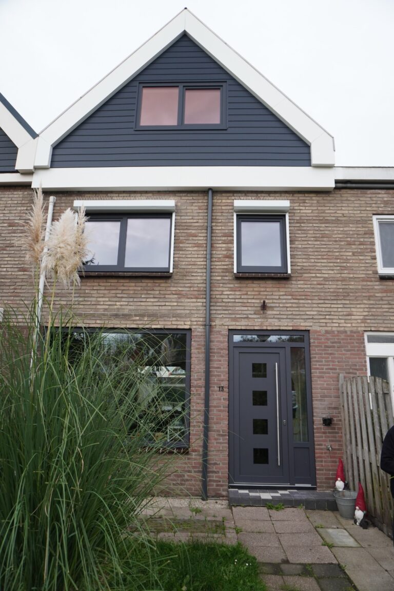 Aan de voor- en achterzijde zijn kunststof kozijnen geplaatst, gecombineerd met een moderne voordeur in antracietkleur.